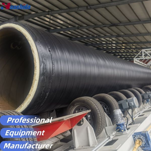 Our company independently developed the spray winding insulation pipe production line, which consists of three parts: shot blasting and rust removal production line, polyurethane spraying production line, and PE winding production line.